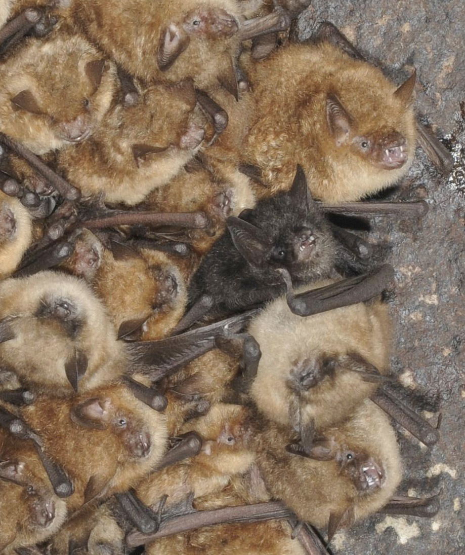 Melanistic, or otherwise atypically coloured bats, are rarely observed. Here we report on a survey of melanistic individuals of Myotis emarginatus (Geoffroy’s bat) in the Northwestern edge of its distribution. Across the sampled region, 31 sites and over 3000 individuals of M. emarginatus were observed. Overall, melanism was found in approximately 2-4% of the populations. To our knowledge this is the highest proportion of melanistic individuals recorded in any bat species thus far. Such large levels of melanism may indicate a recent bottleneck in the population. Further research on the genetic structure and behaviour of this population may help identify the possible causes and consequences of this peculiarity.